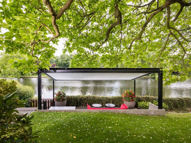 Door het toepassen van een stabiel stalen frame kan ook een pergolascherm vrijstaand gemonteerd worden.